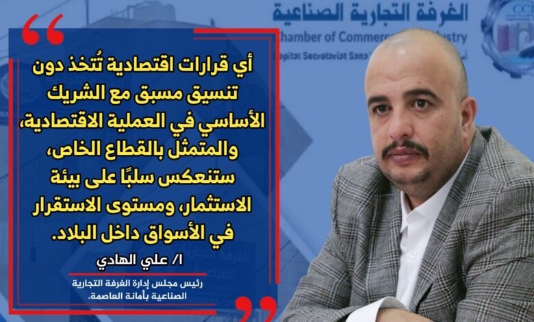 أكد رئيس الغرفة التجارية الصناعية بأمانة العاصمة صنعاء، علي محمد الهادي، أن إدارة الملف الاقتصادي تتركز حالياً بيد الحكومة بنسبة 100%، مشيراً إلى غياب أي شراكة حقيقية مع القطاع الخاص في صناعة القرار الاقتصادي، وهو ما ينعكس سلباً على المستثمرين وعلى الاقتصاد الوطني بشكل عام.
